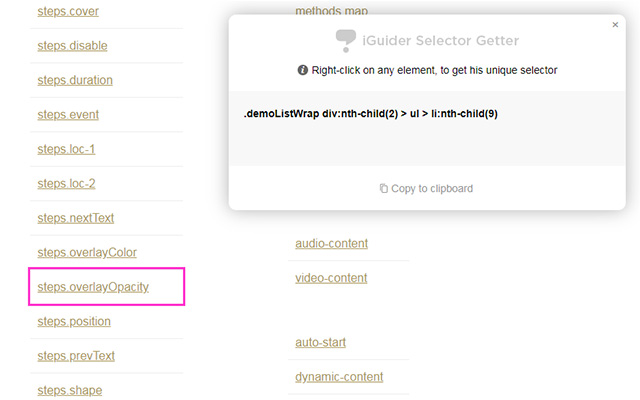 auto-viewingAfter you receive the selector code, you can save it to the clipboard, and then paste it into the iGuider plugin initialization code. Popup window can be moved in the any place of your screen, that it does not block the elements you need.